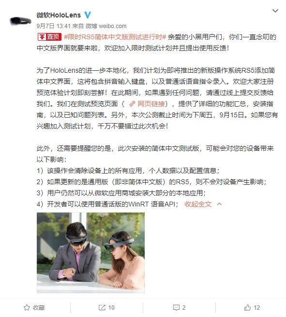 本次HoloLens简体中文版测试是限时参与,大家可以积极参与。