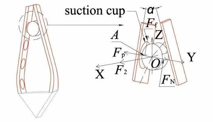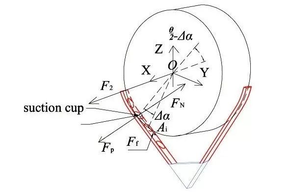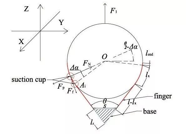当手爪在抓取较大的物体时,手爪给物体施加的力中有一个分力使物体有远离手爪的趋势。如果,手爪通过特定的机制能够抵消这个分力的作用,从而使手爪能够牢牢的抓住物体。比如通过吸盘的吸力或者电磁力等等。我们称这种抓取模式为半包裹抓取(Half-enveloping)。我们通过实验发现,对于我们的手爪,除了在抓取较大物体时使用半包裹抓取模式,在抓取小尺寸的物体时也会呈现半包裹抓取的特性。以下,我们将从抓取大物体和抓取小物体两个方面进行定义和分析。简单起见,分析时假设物体都是圆柱。