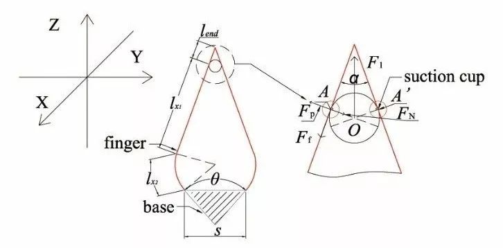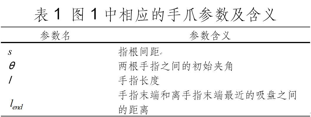 本文所有的分析和实验都是基于图1所示的手爪。图中的手爪参数的含义如表1所示。