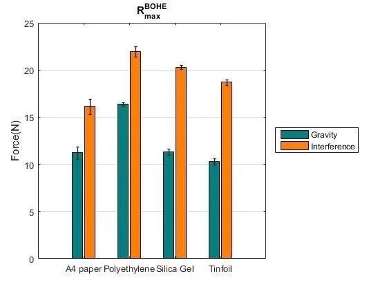 我们通过改变不同尺寸的物体表面材质来测量出对应的抓取模式下能够承受的最大干扰力。实验中一共使用了四种不同的表面材质,分别是普通打印纸质、聚乙烯塑料、硅胶以及锡纸。