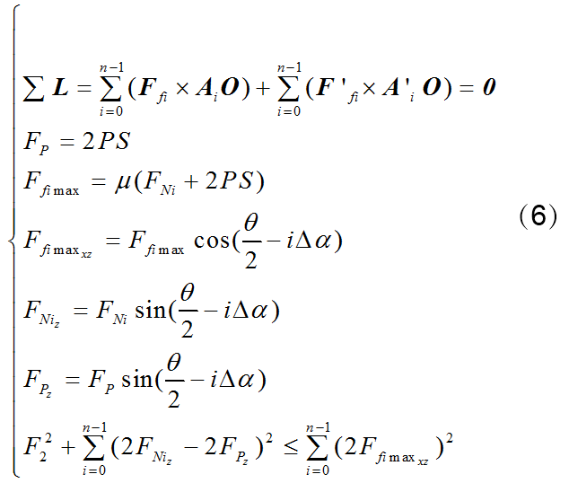 在生活中经常会出现要抓取物体的尺寸比手爪的尺寸大的场景。就像图2(a)所示的抓足球一样。由于物体较大,手爪指根的运动会被物体所阻碍,此时只有指尖可以弯曲。在这种情况下,手爪在物体上接触点的连线时猎狐。并且如果此时只有抓紧力作用在手爪上的话,其中的一部分分力会使物体远离手爪。