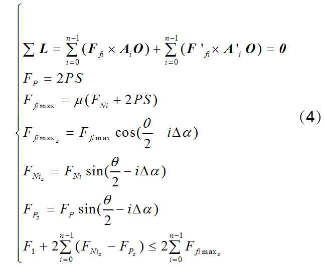 这部分是分析半包裹抓取模式的稳定性。主要是从物体的最大侧向稳定性和手爪在抓紧物体时能受到的最大竖直拉力两个方面进行分析。如图4(a)中的F1为竖直力,图4(b)中的F2为侧向力。