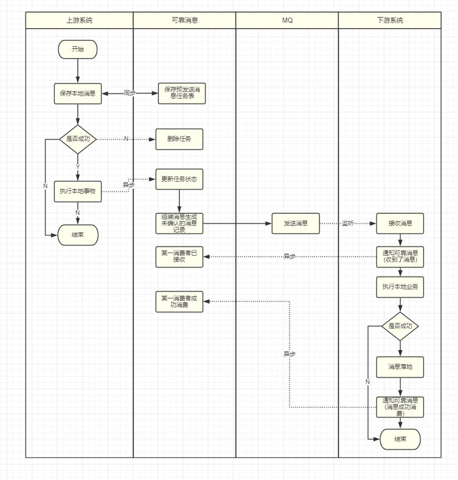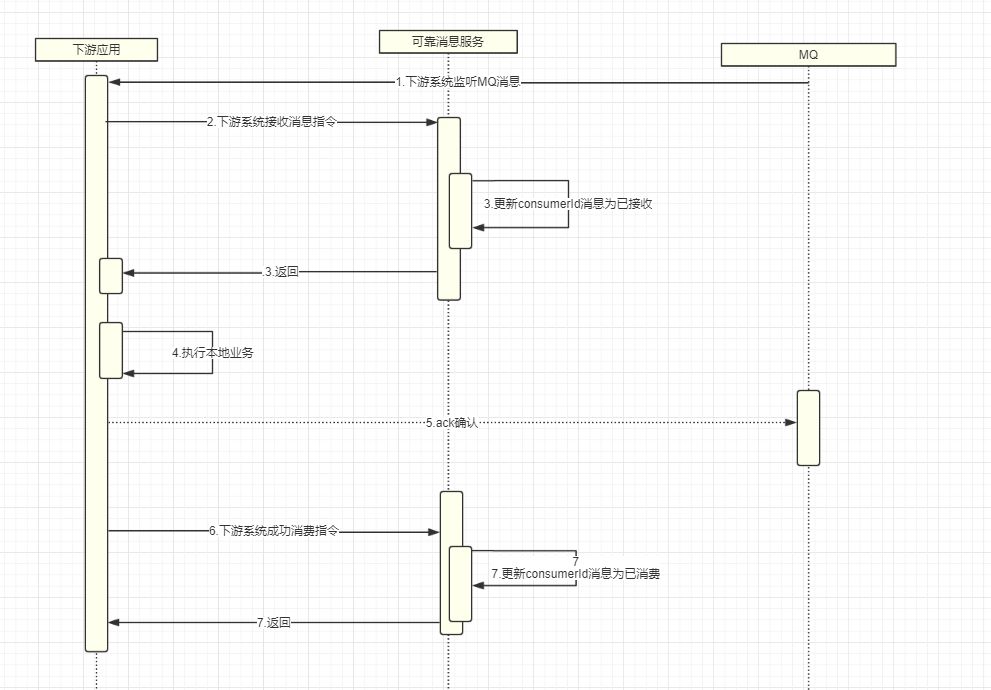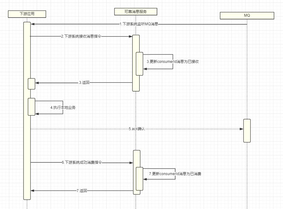 下游应用监听到此消息后,在保证幂等性的情况下重新执行业务并通知可靠消息服务此消息已经成功消费,最终确保上游应用、下游应用的数据最终一致性。具体流程如下: