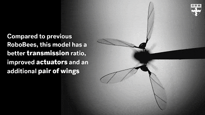 研究人员改进了它的执行器和传动比,让它能够拥有更大的升力,足以携带多出的太阳能电池和机载电子设备。为了容易分辨,Robert Wood团队还给了它一个新名字:RoboBee X-Wing。