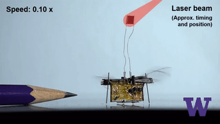 其实,哈佛团队并不是第一个让RoboBee卸掉小尾巴的人。之前大讲堂也介绍过华盛顿大学Sawyer Fuller教授的团队所研发的RoboFly,这位从哈佛走出去的教授改进了原有的RoboBee,是它能够依靠激光提供能源,完成极小范围内的飞行。