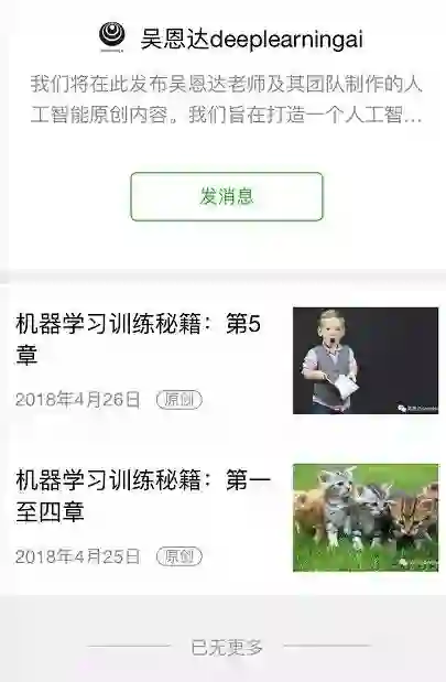 从现有的功能栏来看,这个微信公众号主要发布中文课程资源,目前公开的资源有深度学习课程(视频)、机器学习训练秘籍(书籍)。跟deeplearning.ai一直以来,主力培育全球AI社区、传递AI教育、传播AI观点的节奏很合拍。