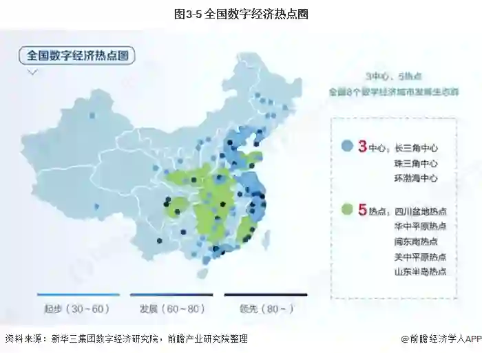 根据《中国城市数字经济指数白皮书》报告指出,目前我国的数字经济呈现出显著的“3中心5热点”的格局,在全国范围内形成8个数字经济城市生态群。
