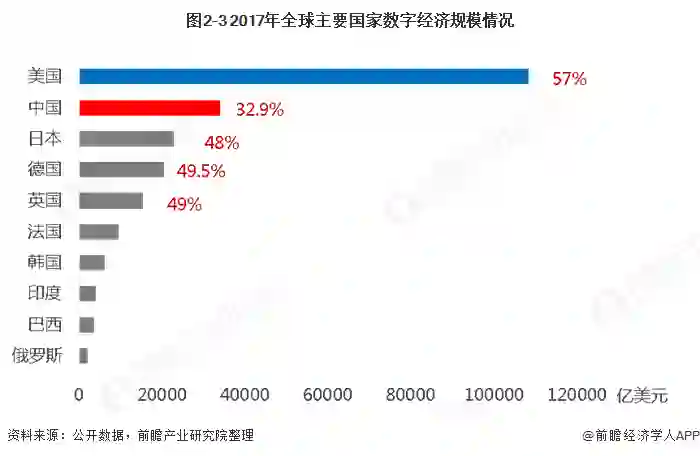 全球数字经济呈现出蓬勃发展之势,其中2017年,美国数字经济规模占美国GDP的57%,驱动能力强,位列全球第一;中国数字经济规模为27.2万亿元,占中国GDP的32.9%,数字经济驱动效应仍有待提升。