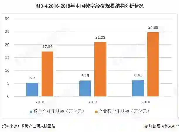 我国的数字经济飞速发展,2017年我国数字经济规模达27.2万亿元,同比增长20.3%,占GDP的比重达到32.9%。截止至2018年我国数字经济规模达到31.3万亿元,按可比口径计算,名义增长20.9%,占GDP比重为34.8%,占比同比提升1.9个百分点。其中数字产业化规模达6.4万亿元,信息消费、数字经济领域投资、数字贸易等需求活力不断释放。