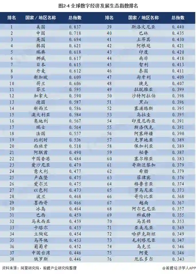 数字经济是基于新一代信息技术,孕育全新的商业模式和经济活动,并对传统经济进行渗透补充和转型升级,根据《2018年全球数字经济发展指数》报告,其中,全球数字经济发展指数排名中国以0.718的指数成绩位列全球第二,数字经济发展程度较高。