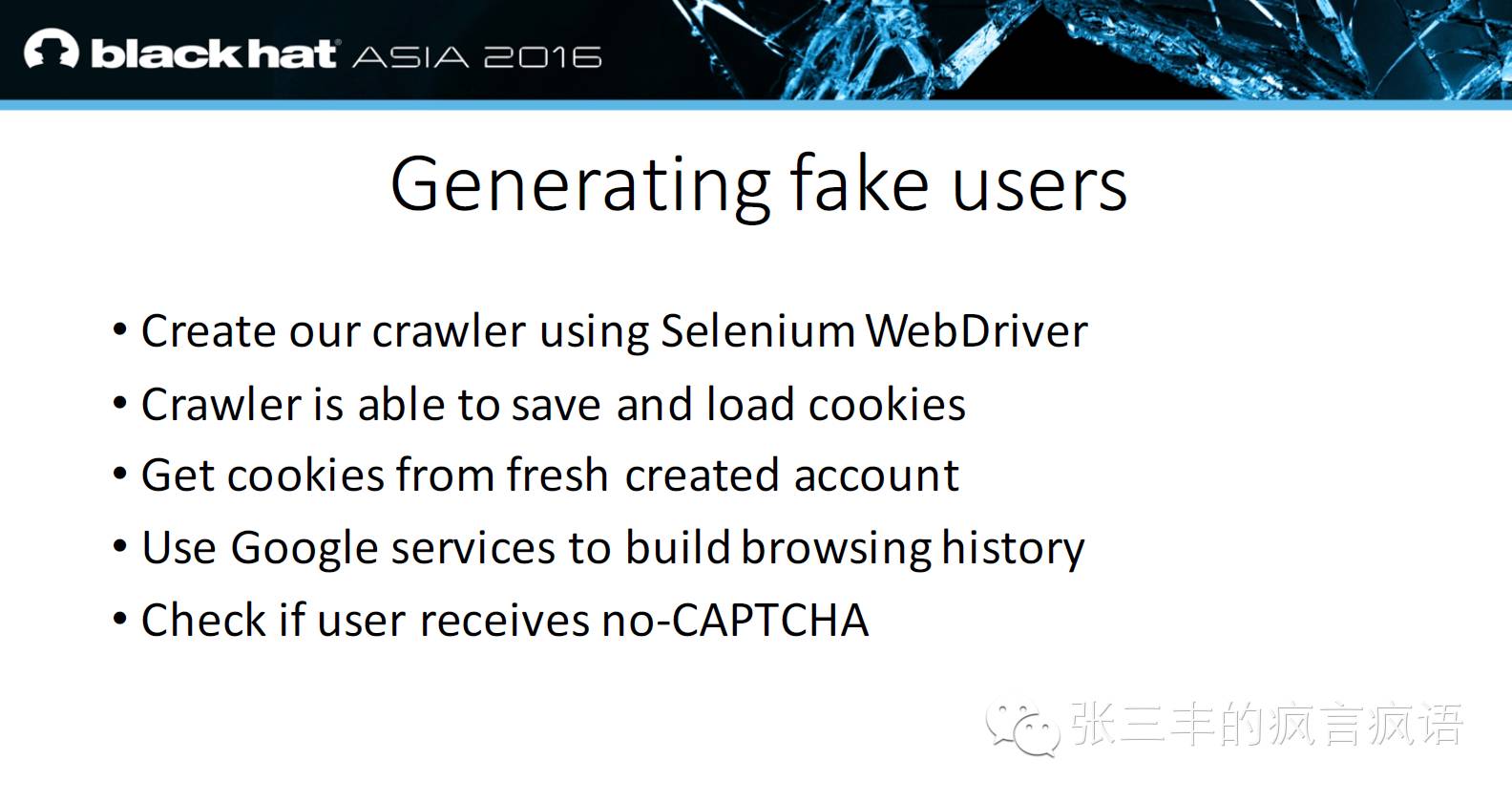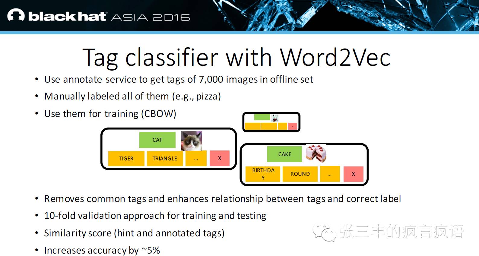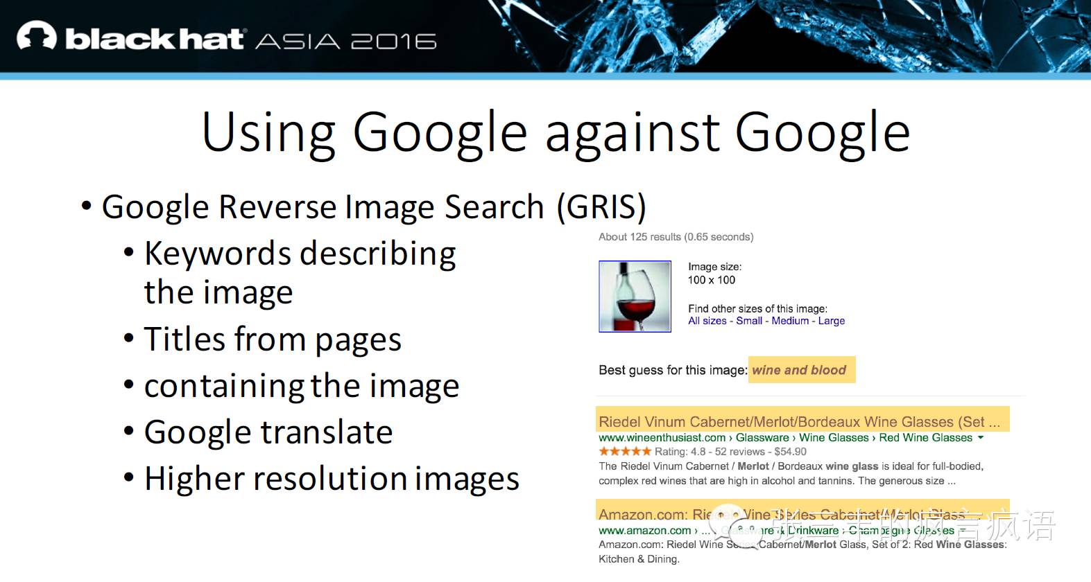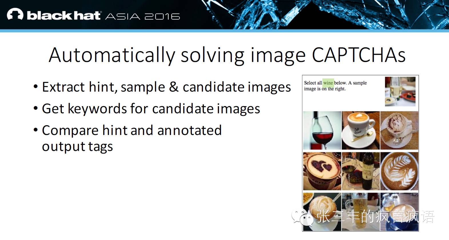 使用利用深度学习提取谷歌图片验证码的关键字信息,并使用Google图片搜索对所有图片进行搜索,以及提取搜索结果中的关键信息,配合图像的语义标注以及图片的标签分类。经过训练与修正,最终全自动化地破解了Google reCAPTCHA,成功率为70.78%,每次破解时间只要19秒。另外对于Facebook的图像验证码,实现83.5%的成功率。
