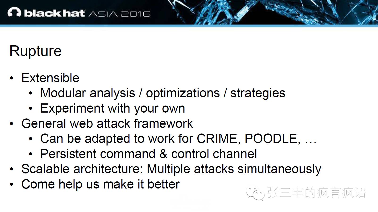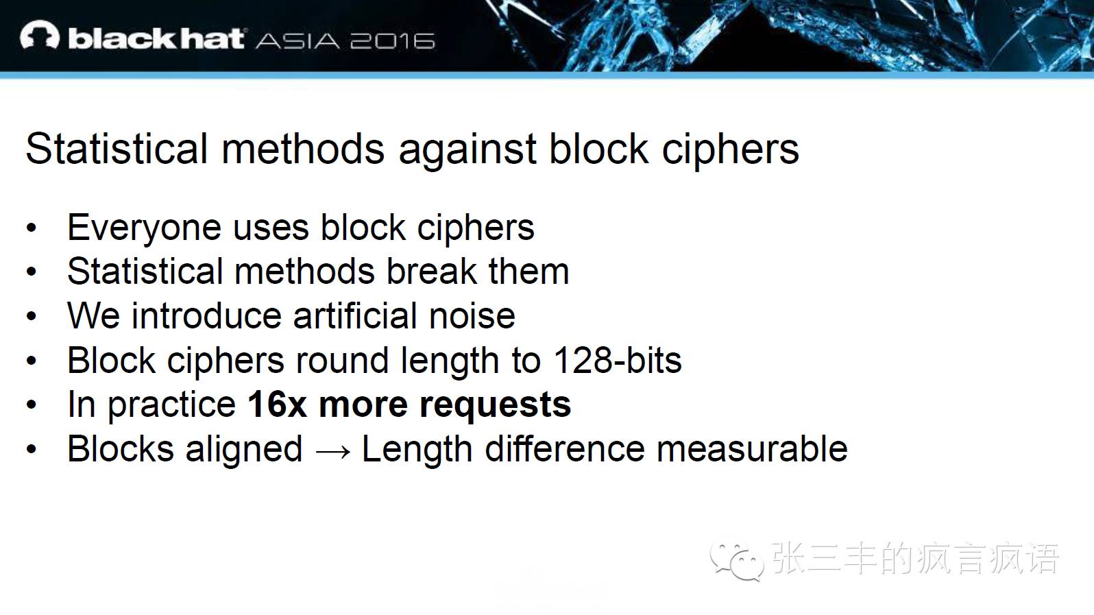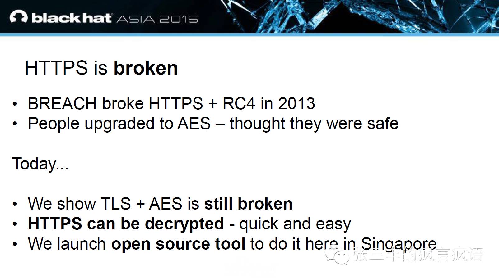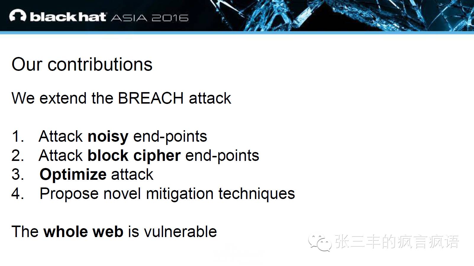 而在本次黑帽大会上,发布了对BREACH攻击的改进与优化,使得攻击SSL/TLS更为容易与迅速,即使HTTPS使用了128位的AES加密算法,也可以被攻击。