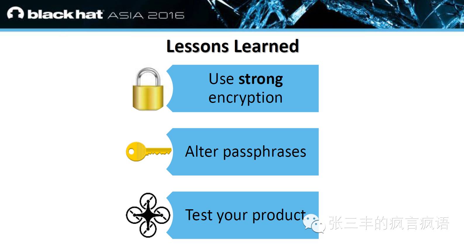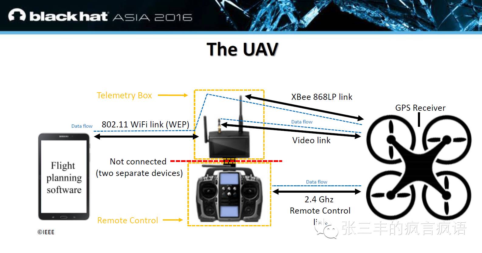 除了常见的破解手机客户端与控制器直接的WIFI连接。更主要是演示了通过攻击无人机与控制器之间通信的Xbee模块(XBee是美国MaxStream公司基于ZigBee技术的一个无线传输模块)而完成无人机的劫持。攻击这么容易是因为无人机中Xbee芯片并没有加密通信的内容。