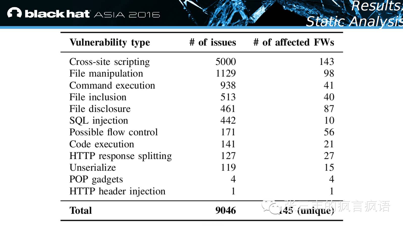 除了常规Web漏洞,固件写死的密码,证书等分析固件本身可以检测的问题也可以检测: http://firmware.re/keys-n-pass/