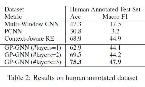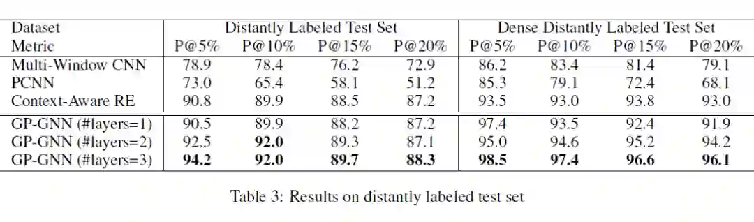 论文在人工标注的测试数据集和远程监督标注数据集上进行了实验。本文最佳模型在所有三个测试集上的性能均明显优于所有基模型。这些结果表明 GP-GNN 模型可以使用自然语言生成的参数对完全连接的图成功进行推理。这些结果还表明本模型不仅在句子级关系提取上表现良好,而且在袋级关系提取上也有所改进。