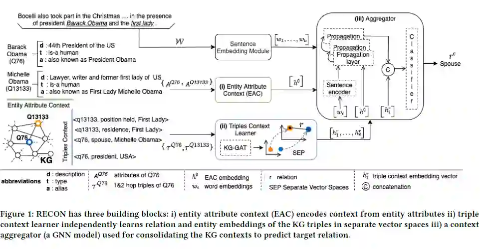 RECON 架构如图 1 所示。句子嵌入模块对输入的句子进行静态嵌入检索,实体属性上下文(EAC)模块使用实体属性(如别名、标签、描述和实例)从 KG 中获取句子中的每个实体,并使用相应的上下文表示来丰富实体嵌入。三元组语境学习模块学习给定实体的 2 跳邻域内实体和关系的表示。图神经网络最终被用来聚合实体属性、KG 三元组和句子上下文,并使用一个关系分类层生成最终输出。