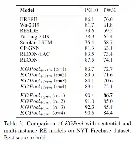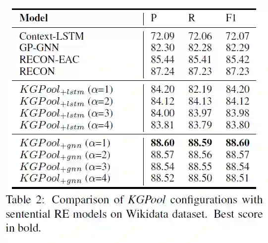 论文所用数据集与上一篇文章相同是 Wikidata dataset 和 NYT Freebase 数据集,并与最先进的方法做了对比实验。从实验结果可以看出,总的来说,KGPool 为句子上下文稀疏的结构提供了一种有效的知识表示。随着选择系数