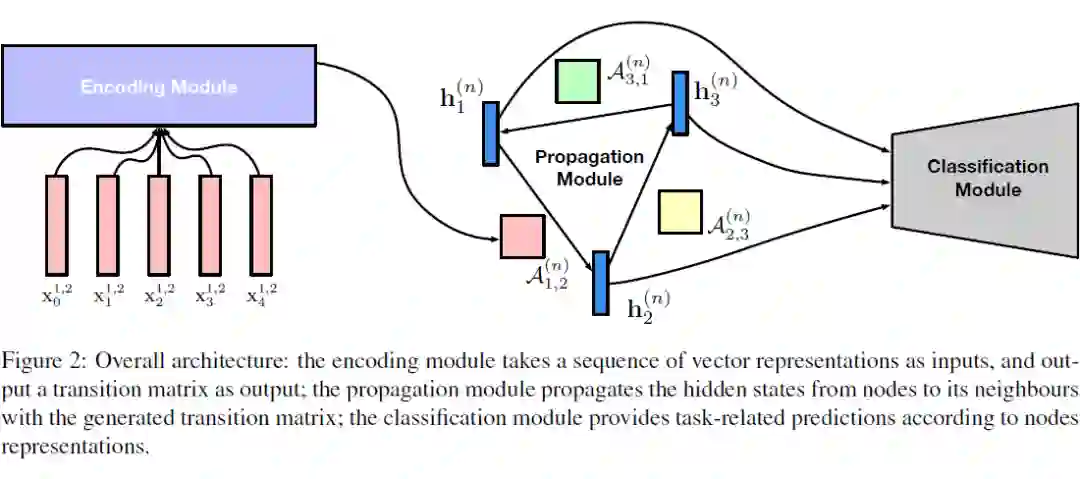 GP-GNN 首先用文本序列中的实体构造一个全连接图, 之后使用三个模块来处理关系推理:(1)使边能够对自然语言中的丰富信息进行编码的编码模块;(2)在各个节点之间传播关系信息的传播模块;(3)使用节点表示进行预测的分类模块。编码模块将一系列向量表示作为输入,并输出一个转移矩阵, 传播模块利用生成的转移矩阵将隐藏状态从节点传播到其邻居,分类模块根据节点表示提供与任务相关的预测
