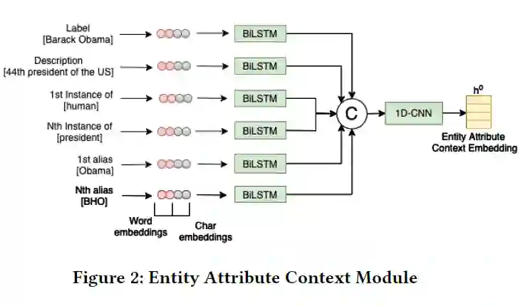 EAC 模块使用实体属性(如别名、标签、描述和实例),从 KG 中获取句子中的每个实体,并使用相应的上下文表示来丰富实体嵌入。对于每一个属性中,将单词和字符嵌入连接起来,并将它们通过 BiLSTM 编码器传递。BiLSTM 网络的最终输出被堆叠并送入图2中描述的一维卷积网络(CNN)。