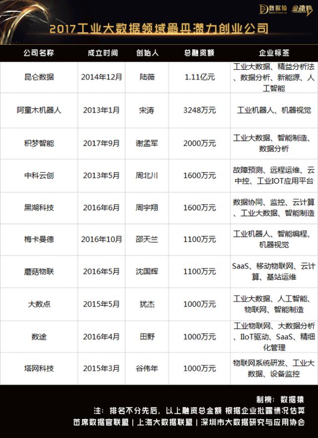 基于此,数据猿通过对成立于2012年之后,在资本市场上获得高度认可,业务发展迅速、业界口碑良好,且为非被收购企业、非上市公司的所有独立创业公司近1年的关注,并与上海大数据联盟、首席数据官联盟、深圳大数据产业协会四方的共同探讨与研究,评选出以下10家在2017年表现优异的中国工业大数据领域最具潜力的创业公司供业内参考。
