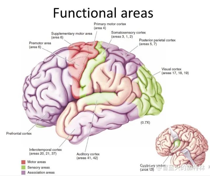 (3)怎样防止“梯度消失”:(1)中提到了,脉冲是离散的,所以其实是不存在梯度的,那么我所理解的就是如果大脑在进行迭代过程中更新的权重过小怎么办?这个问题,就引出了大脑的长期记忆功能,“一朝被蛇咬,十年怕井绳”,你小时候遇见了一件非常可怕的事情为什么你能够记一辈子呢?这就引出了大脑的cell assembly(细胞集群)的特点了,下图就是大脑的功能分区,我们在处理一件事情的时候,可不是所有的分区都在工作的,其实只用到了其中一部分,所以就本着谁的活谁干的原则。如果你24小时干同一件事情,大脑中负责你干活的那块区域不整点活儿不得被你活活累死。所以大脑的不同区域内部之间是存在集群效应的,它们之间的相互紧密连接,相互抱团,有点类似与循环神经网络的结构,由于绑定的非常紧密,突触之间的权重也非常高;这就回答了你的梯度消失:大脑A分区平时不工作,消停待着,但是如果开始工作,只要有一个脉冲进来,整个分区集群就会瞬间被激活,进行工作,相互之间产生脉冲,相互之间更新权重,大脑就开始进入训练阶段了~!,如果你持续做事件A,A分区就会一直处于激活状态,就像嚼了炫迈一样;如果你突然不做A了,A分区就没有外接刺激,由于神经元的不应期和STDP的学习机制,它就会一点点的萎下来,再次恢复待机状态,所以也就不存在所谓的梯度消失;不知道我这样说是否能够算回答你的第一个问题;