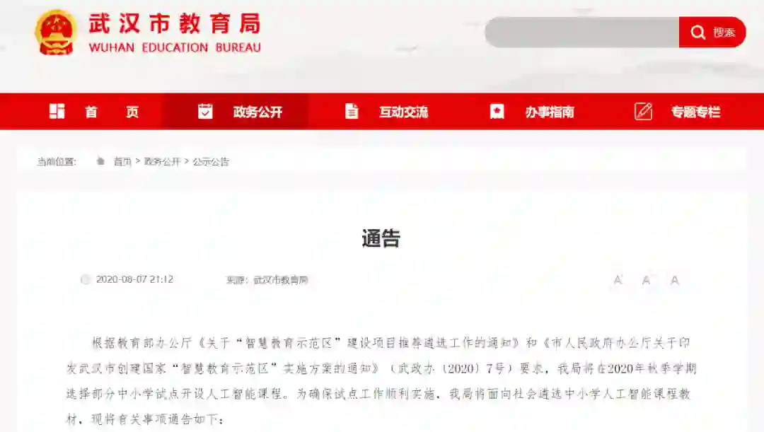 据《长江日报》等媒体报道,近日,武汉市教育局发布通告,2020 年秋季,武汉将在部分中小学试点开设人工智能课程,目前正在面向社会遴选中小学人工智能课程教材。
