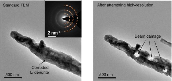 众所周知,锂金属枝晶和固体-电解质界面 (SEI) 是困扰锂电池发展的两大问题,但其生长方式与结构并不清楚。因为锂金属活性强,在空气和电子辐射下都不太稳定,传统的透视电镜很难用于其精细结构研究。这从下图可以看出,在传统的透视电镜下,锂枝晶已经被腐蚀而显得表面粗糙,而且电子辐射下出现严重的破坏。