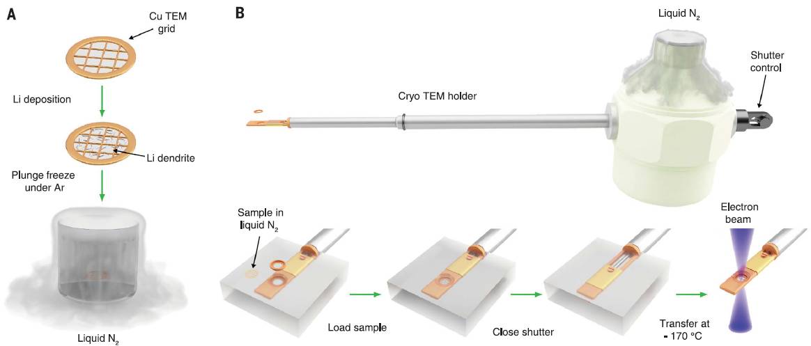 为克服这一困难,并借鉴生物冷冻电镜样品制备方法,崔屹组发展了新的用于冷冻电镜的材料样品制备方式,如下图所示:先在TEM铜网以常规电化学方式沉积锂枝晶,然后以液态电解质清洗,随后迅速置于液氮之中,保持其形貌与结构,用于冷冻电镜观察。