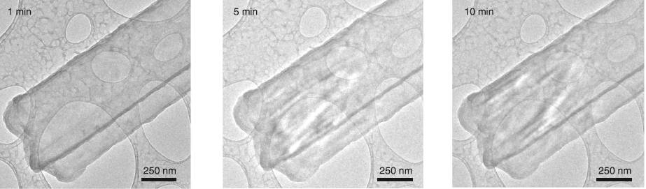 以此方式制备的锂枝晶样品表面光滑,而且在电子辐射下相当稳定,照射10分钟,也没有被破坏,如下图所示。