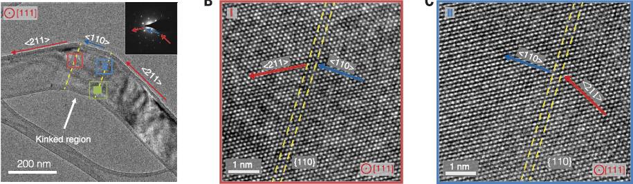 此外,他们还发现枝晶生长过程中可能拐弯,出现拐角,而且拐角处不存在缺陷。这与其他类型的单晶纳米线生长略有不同。