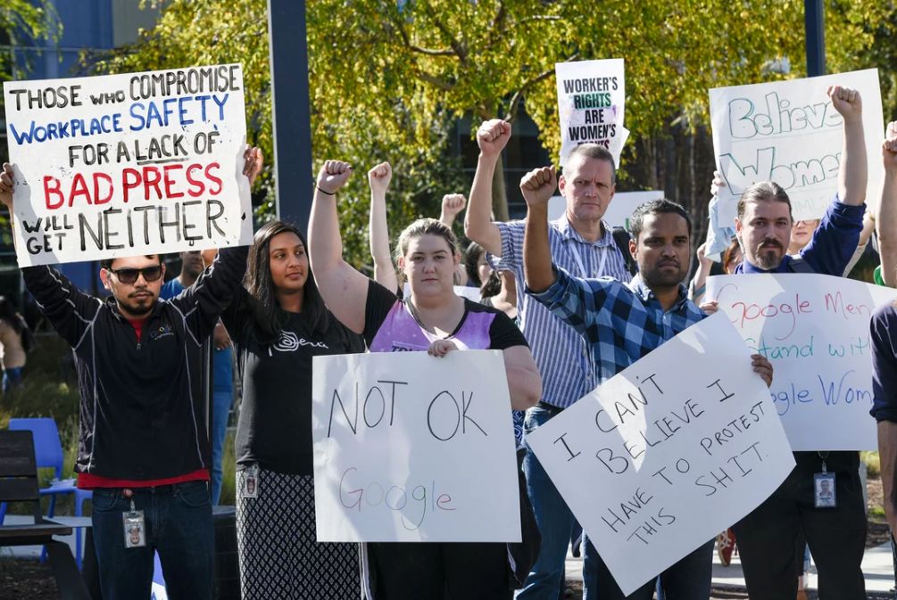 当地时间上午11点10分,100名员工走出谷歌办公室。13个小时后,该公司纽约总部的电梯里挤满了人,以至于员工们要走楼梯下楼,到街上抗议。作为抗议游行的一部分,在奥斯汀,谷歌员工为性侵犯受害者默哀了两分钟。在旧金山,数百名员工聚集在历史悠久的渡轮大厦对面,高呼“Time’s Up at Google”,并举着“工人的权利就是妇女的权利”、“免费食物≠安全空间”等标语。