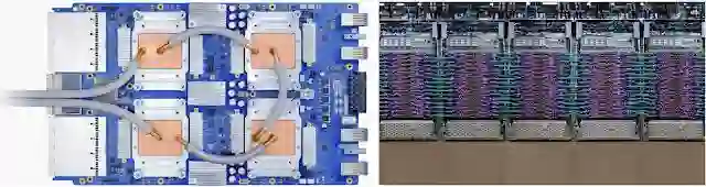 单个 TPU v3 设备(左)与 TPU v3 Pod 的部分部件展示(右)。TPU v3 是谷歌最新一代的 Tensor Processing Unit(TPU)硬件。它以云 TPU v3 的形式对外出售,采用液体冷却技术以获得最佳性能(计算机芯片 + 液体 = 太有意思了!),而完整的 TPU v3 Pod 将可以为全球最大的 ML 任务提供高达 100 petaflops 的计算能力。