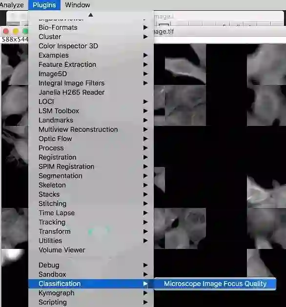 在 Fiji(图像 J)里面,一个 TensorFlow 模型对显微镜细胞拼接图像的聚焦质量进行了评估。边界的色调表示预测的焦点质量,边界亮度表示预测的不确定性。