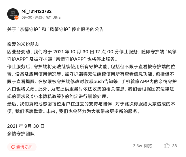 近日,小米社区发布公告,宣布将于 10 月 30 日 12 点关闭 “亲情守护” 功能,随即守护端“风筝守护 App ”及被守护端“亲情守护 App”也将停止服务。