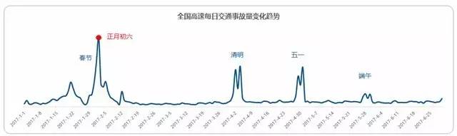 报告显示,由于节日期间公众集中出行,因此全国高速事故量受节日影响明显。在2017年上半年的节日期间,春节的最后一天正月初六,由于正值春节返程拥堵高峰,全国高速事故量因此达到了最高。从24小时事故发生量看,工作日下午时段要高于上午,事故高峰出现在16:00~17:00;节日期间出返程时段事故易高发,出程事故发生高峰为10:00~11:00,返程高峰为16:00~17:00,且返程事故量高于出程事故量。