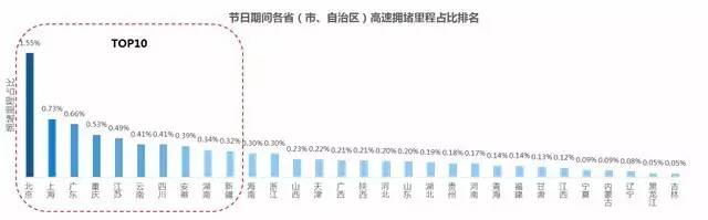 从节日期间各省高速拥堵里程排名看,南方高速拥堵要高于北方,其中广东省高速拥堵里程最高,达102.7公里。从各省拥堵里程占比分布看,高速拥堵里程占比最高的为北京,其次为上海、广东、重庆、江苏等省市,排名最后的为东北三省。