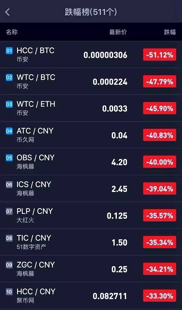 4日下午15时,央行等七部委联合发布关于防范代币发行融资风险的公告,要求各类代币发行融资活动应当立即停止。24小时过去了,90%的数字代币们仍处于下跌状态。此外,截至今日凌晨,60家被中国互金协会点名要求整改的ICO平台,超半数已经进入“清退”流程,或下架ICO代币或暂停服务,一些ICO项目方同时着手退币等事宜。 数据显示,目前全球市场上正在交易的580多种数字代币中,约520种处于下跌行情,截至发稿,今日跌幅最大的前五种代币仍保持在50%的跌幅。