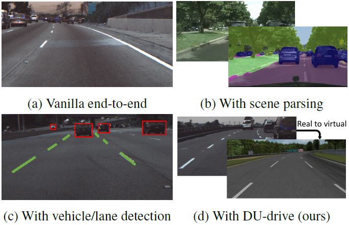 在基于视觉的自动驾驶的范围内,单纯的端到端模型是不可解释的且只有次优的表现,而居中的感知模型需要分割掩码或检测边界框等额外的中间表征,在我们向更大的规模发展时,其标注成本可能会高得无法实现。原始图像和现有的中间表征还充满了与车辆指令预测无关的麻烦细节(比如前面车辆的风格或道路之外的景观)。更重要的是,之前的所有研究都无法应对臭名昭著的域转移(domain shift)问题——如果我们要将收集自不同来源的数据融合到一起,那就会极大地阻碍模型的泛化能力。在这项研究中,我们通过利用收集自驾驶模拟器的虚拟数据而解决了上述限制;我们还提出了 DU-drive,这是一种用于端到端驾驶任务的无监督真实域到虚拟域的域统一框架。它可以将真实驾驶数据变换成其在虚拟域中的规范表征,然后可以据此预测车辆控制指令。我们的框架有几个优点:1)可以将收集自不同源分布的驾驶数据映射进一个统一的域;2)可以利用可以免费获取的有标注的虚拟数据;3)可以学习到驾驶图像中专用于车辆指令预测的可解释的规范表征。我们在两个公开的公路驾驶数据集上进行了大量实验,结果清楚地表明了 DU-drive 的表现优越性和解释能力。