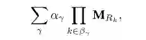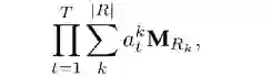 在tensorlog框架中,实体使用onehot向量表示,每一种关系都使用邻接矩阵表示,那么一个head relation所对应的若干条关系可以表示成如下形式: