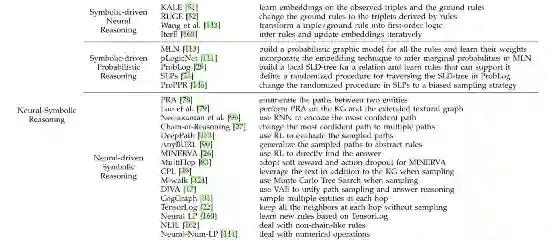 相比于之前的两种类型,神经驱动的符号推理的目的是挖掘规则,而神经网络在其中扮演的作用是解决纯符号推理的不确定性,并且能够有效的减少搜索空间。这种类型的方法的基本思路是找到query的多跳邻居节点,然后根据概率从这些邻居节点中选择正确的答案。这类方法大致可以分为三类,基于路径的、基于图的和基于矩阵的。