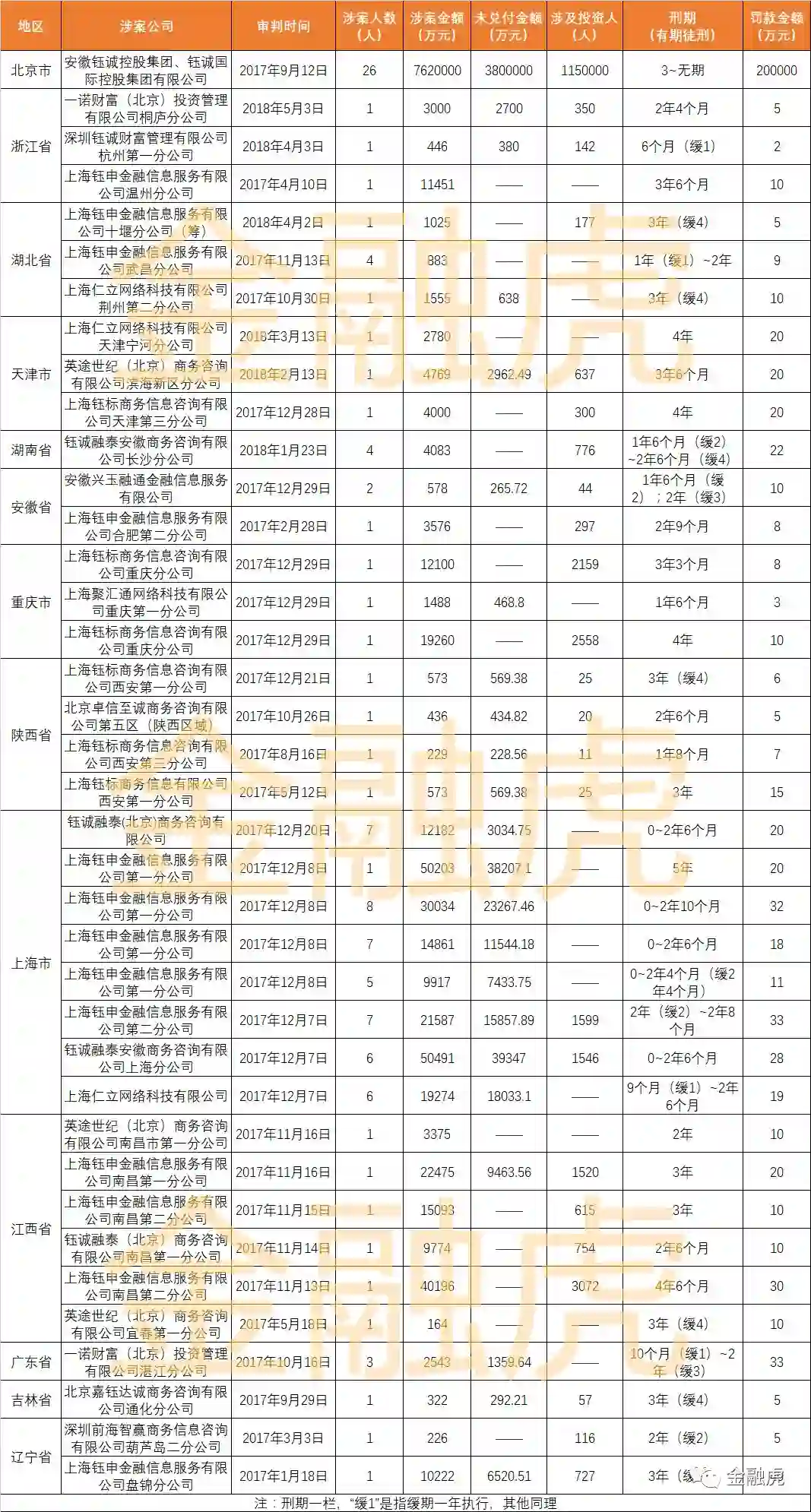 散落在各地的关联公司:北京、上海、天津、浙江、重庆、安徽、广东、湖北、湖南、江西、陕西、吉林、辽宁,累计13个省市,38起诉讼,已经相继做出宣判,111人入狱,罚款超20亿。