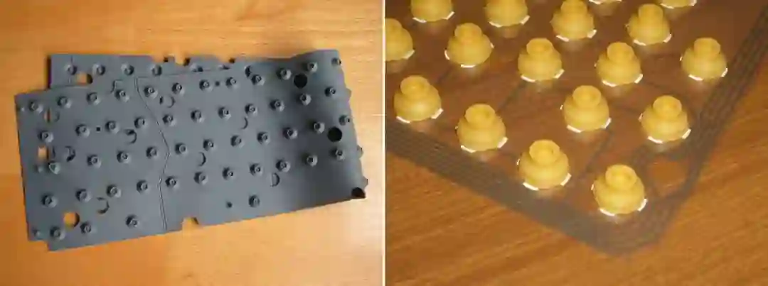 左:整张胶碗(Fujitsu FKB4700-152);右:薄膜电路与附着的分离式胶碗(Apple Design Keyboard NMB Version)左右两图图源:Daniel Beardsmore from Deskthority Wiki "Rubber dome"
