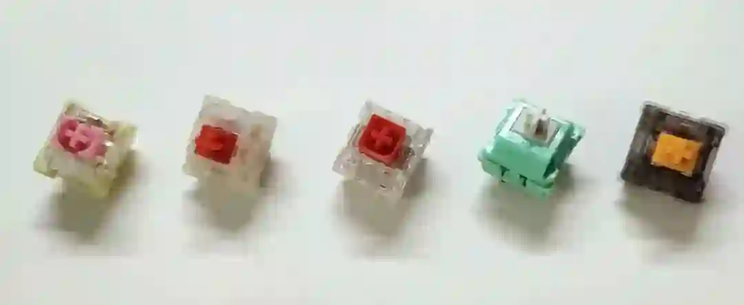 从左到右依次为:TTC 金粉轴聚光镜版,佳达隆红轴,凯华 BOX 红轴,康腾特白菜豆腐轴,精微科 FFF 轴