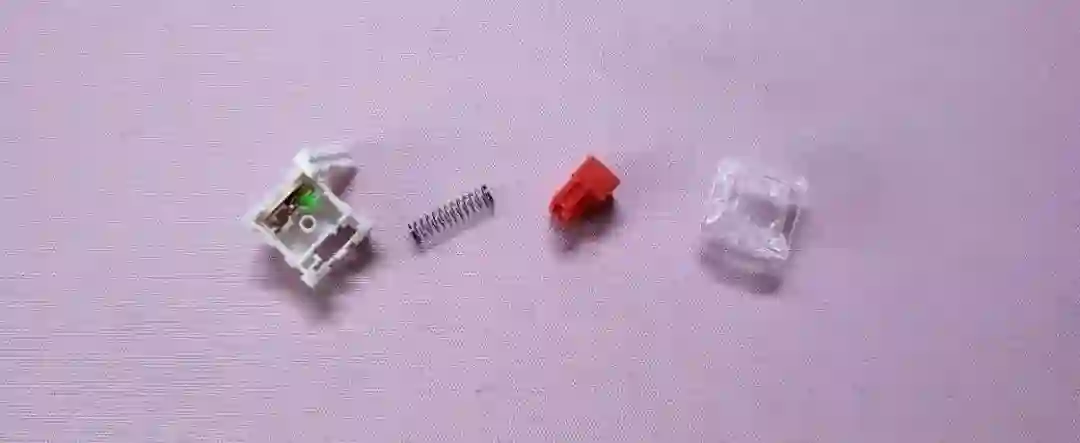 机械键盘轴体可以大致分为 4 个大部分,轴盖、底座、轴心、弹簧。在前一篇,我讲过机械轴体的触发原理,其中提及的推杆就是轴心,它的形状决定了轴体的基本手感;弹簧决定了轴体的轻重(压力克数);动静片两个金属片就嵌在底座上,用镊子也可以拔下来。