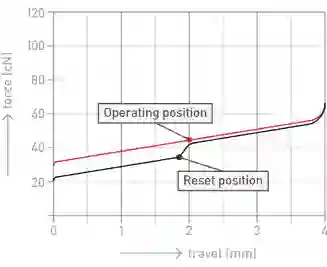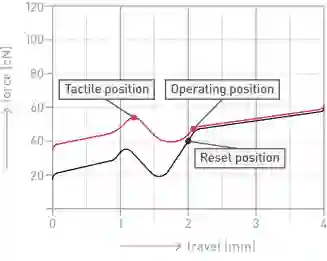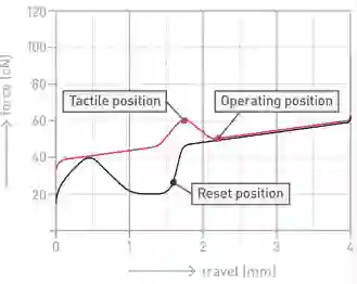 压力曲线上的每一个点就是在当前距离时,手指需要的按压力度。一般压力曲线上会有两条线,一条是按压曲线(上图红线),一条是回弹曲线(上图黑线)。通过观察压力曲线,你就可以弄明白它反映出的轴体手感究竟是怎样的。