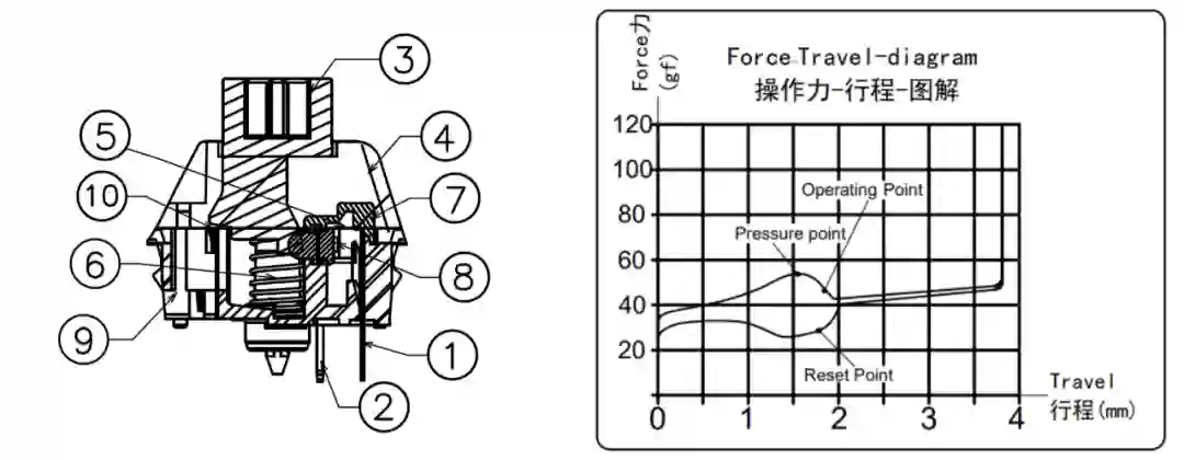 BOX 白轴示意图,来自凯华 BOX 白轴(CPG1511F01S110)规格书。图中 10 即为扭簧位置,上方轴心(斜线阴影)凸起拨动扭簧发声,轴心右侧推动 8 滑杆,压迫动静片连通轴体。右图为 BOX 白轴的压力曲线