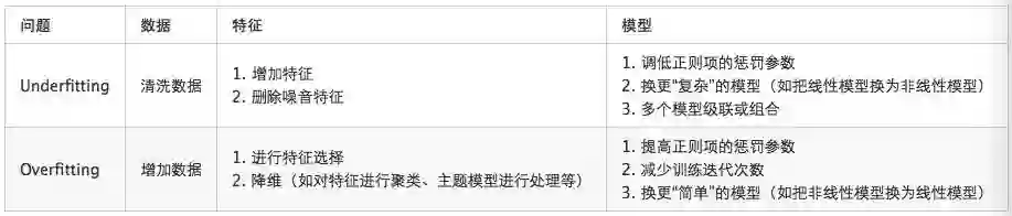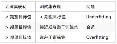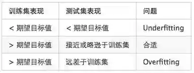 在实战中,可以基于模型在训练集和测试集上的表现来确定当前模型到底是Underfitting还是Overfitting,判断方式如下表: