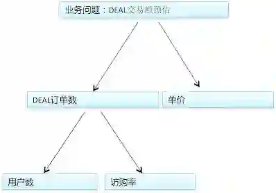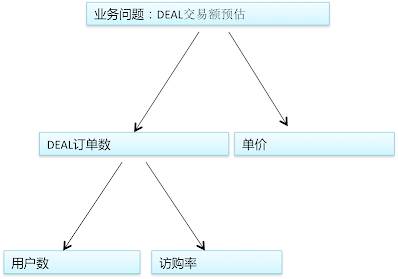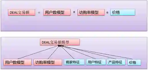 按照上图进行拆解后,预估DEAL交易额就有2种可能模式,一种是直接预估交易额;另一种是预估各子问题,如建立一个用户数模型和建立一个访购率模型(访问这个DEAL的用户会购买的单子数),再基于这些子问题的预估值计算交易额。