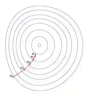 即w沿着损失函数的负梯度方向进行调整,示意图见下图,的梯度即一阶导数(见下式),梯度下降有多种类型,如随机梯度下降或批量梯度下降。