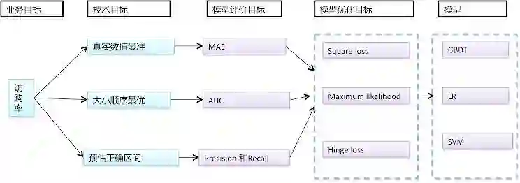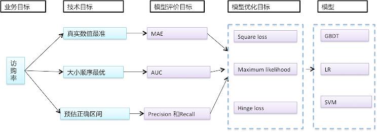 为实际问题选择模型,需要转化问题的业务目标为模型评价目标,转化模型评价目标为模型优化目标;根据业务的不同目标,选择合适的模型,具体关系如下: